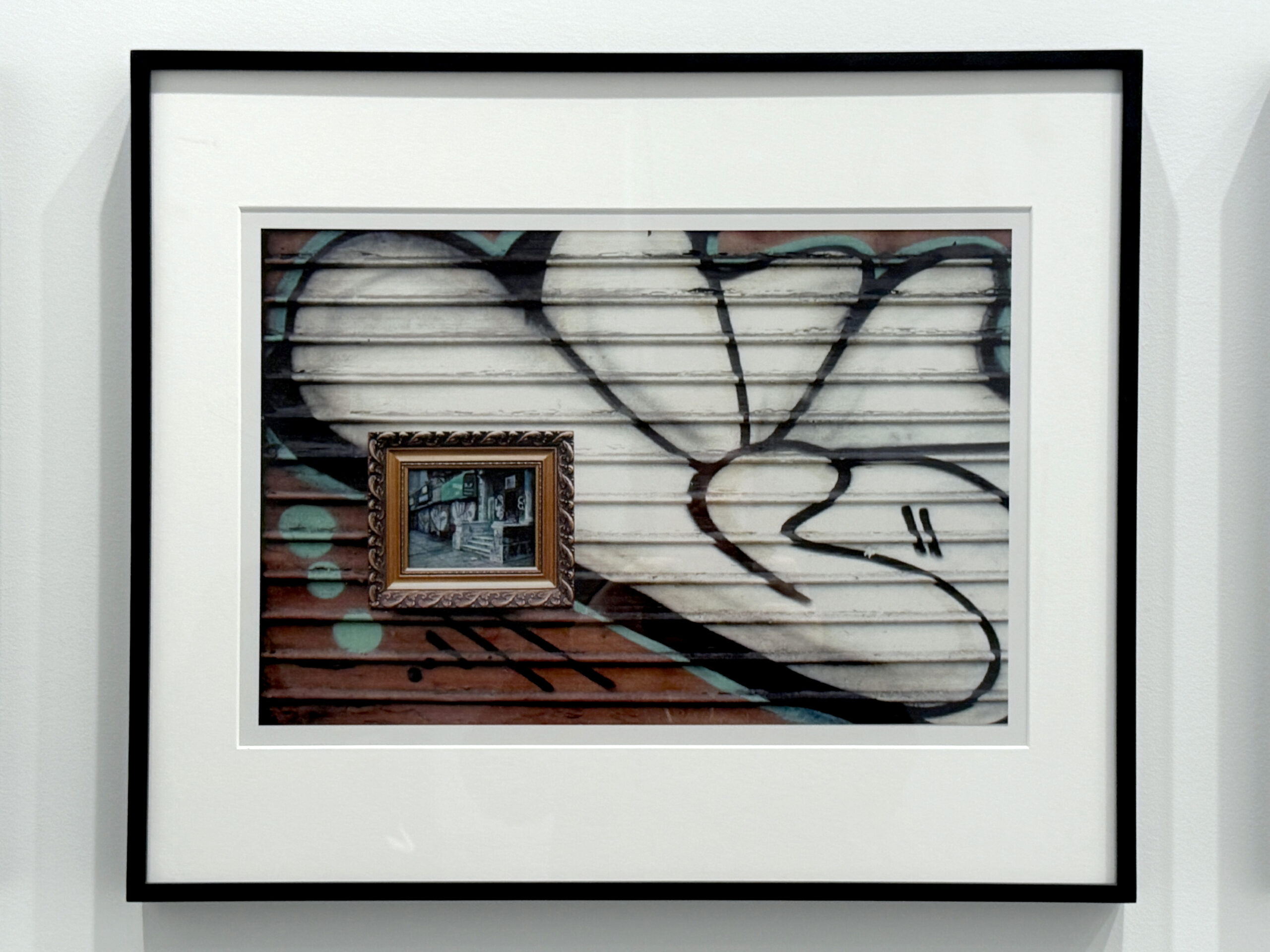 Ellen Harvey’s “postcard” is a photograph of her painting of Lennox Avenue, hung on a graffiti-covered gate in that section of Lennox Avenue. The graffiti featured in the painting and photograph is by Jonone (Jon Perello). The painting is one of a series of paintings of graffiti in vintage frames called Paintings of Paintings.