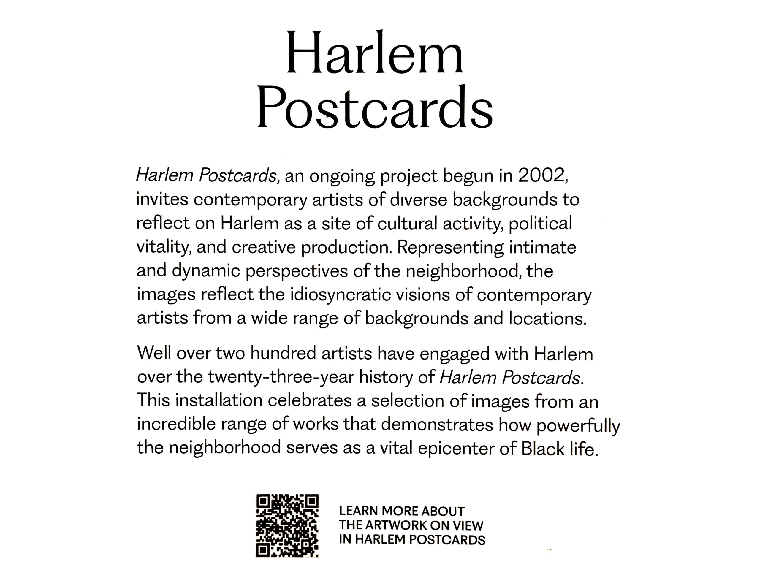 Harlem Postcards is an ongoing project of the Studio Museum in Harlem, begun in 2002, that invites contemporary artists of diverse backgrounds to reflect on Harlem as a site of cultural activity, political vitality and creative production through the production of an image for a postcard. The resulting postcards were issued as a set in 2023. A selection of the resulting image were hung in 2025 as part of the reopening of the Studio Museum in Harlem.